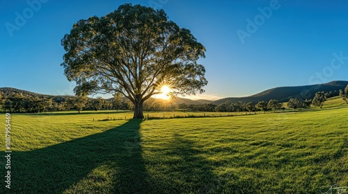 © raja, Obraz premium A solitary tree stands tall in a field, its silhouette outlined against the setting sun.
