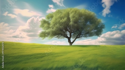 Obraz premium A solitary tree stands tall in a grassy field under a blue sky with puffy...