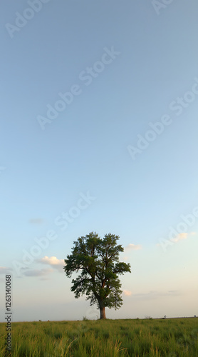 Fototapeta premium A solitary tree stands tall in an open field under a clear blue sky,...