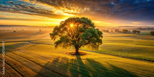 © Autun, Obraz premium A solitary tree, viewed from above, showcases nature's serene beauty in high-resolution 4K.
