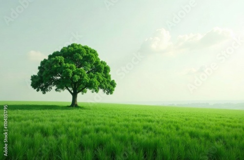 © Tom, Fototapeta premium A solitary tree with abundant green foliage is set against a backdrop of a bright meadow under clear skies, basking in sunlight. Generative AI