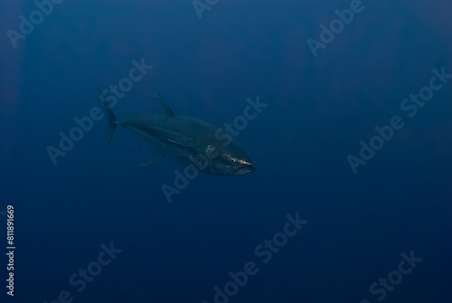 Naklejka premium A solitary tuna glides through the deep blue sea, its sleek form a symbol of speed and grace in the vast ocean wilderness