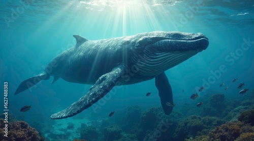 Fototapeta premium A solitary whale swimming gracefully in the open ocean, its massive body partially submerged light rays coming through surface 3d render