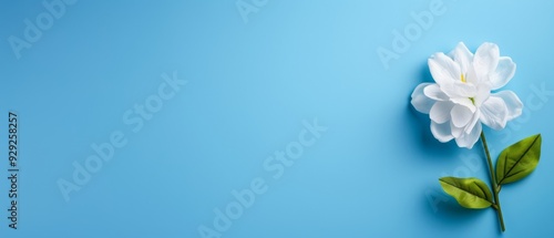 © Mikus, Obraz premium A solitary white bloom atop a verdant green leaf against a backdrop of tranquil blue