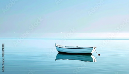 © elviana, Naklejka premium A solitary white rowboat is gently floating on a vast expanse of calm, blue water under a clear sky.