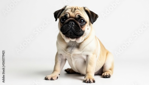 © Anulak, Fototapeta premium A solo pug, showcasing its endearing features on a stark white backdrop, dog breeds, companion, breeds