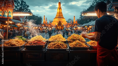© bird_saranyoo, Obraz premium A solo traveler eating pad thai at a bustling street market with the magnificent Grand Palace in Bangkok glowing in the distance, reflecting Thailand
