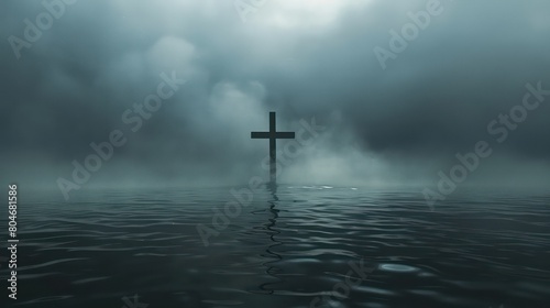 © Ibad, Naklejka premium A somber and atmospheric depiction of a cross shrouded in mist, emerging from dark waters. Symbolic of hope amidst turmoil. Concept of redemption, mystery, and the steadfastness of faith