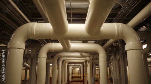 Obraz premium A sophisticated arrangement of large white industrial pipes forms a complex network within a sterile mechanical room environment