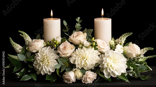 Fototapeta premium A sophisticated floral arrangement for a dinner table, featuring candles and...