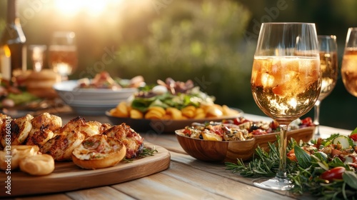 Naklejka premium A sophisticated outdoor dining arrangement featuring delicious dishes and refreshing beverages, surrounded by a serene backdrop of greenery and sunlight in the evening.