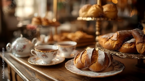 Naklejka premium A sophisticated tea-time bakery with delicate porcelain cups and warm bread
