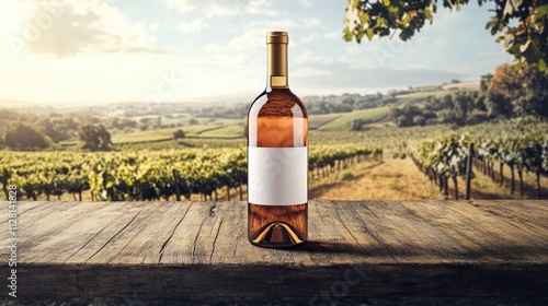 © Natchooda, Fototapeta premium A sophisticated wine bottle mockup on a rustic wooden table, with a clear view of the label, set against a vineyard background for a classy touch