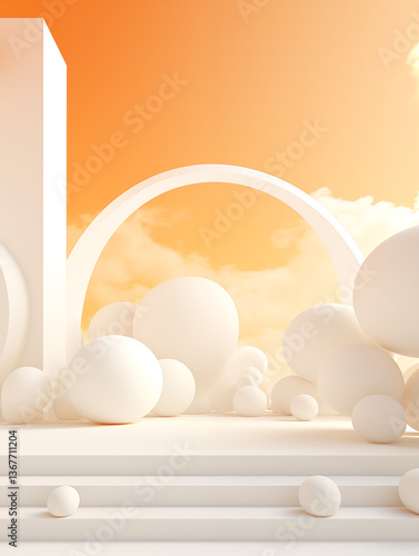© Luna, Fototapeta premium A space decorated with spherical ornaments in orange and white, suitable for use as an e-commerce product background image.
