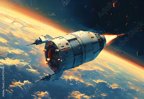 © Світлана Старецька, Obraz premium A spacecraft ascends through the atmosphere, powered by a fiery engine, as it approaches orbit above a cloud-covered Earth during dawn light.