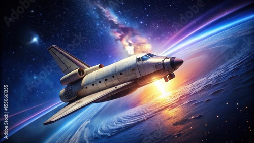© PloyJai, Naklejka premium A Spacecraft's Majestic Flight Over a Vibrant Planet, Illuminated by a Cosmic Dawn