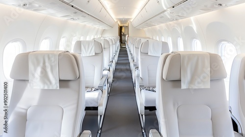 Fototapeta premium A spacious and modern interior of an airplane cabin showcasing empty seats and a bright atmosphere.