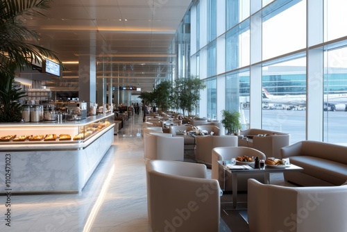 Fototapeta premium A spacious café interior with large windows overlooking the airport runway, offering passengers a serene place to enjoy refreshments before their flights.