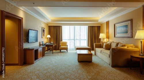 Fototapeta premium A spacious hotel suite featuring a living area with comfortable furniture and natural light.