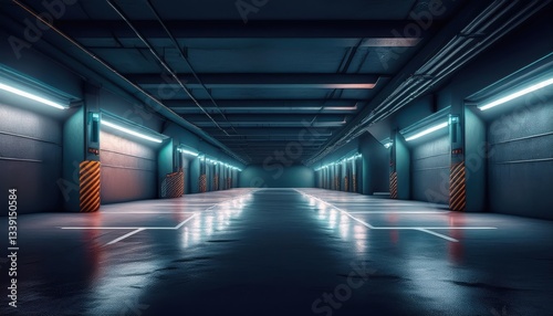Fototapeta premium A spacious industrial garage boasts sleek lines, modern lighting, and a dramatic atmosphere.