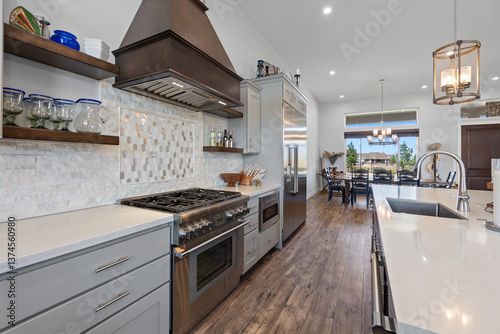 © Allison, Fototapeta premium A spacious kitchen featuring a large island and nicely designed wooden chairs