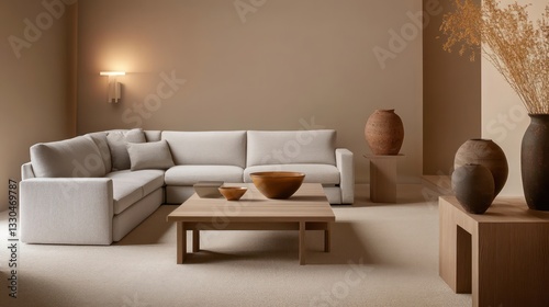 © Muhammad, Fototapeta premium A spacious living room featuring a light gray fabric corner sofa with matching armchair, a minimalist wooden table adorned with modern vases