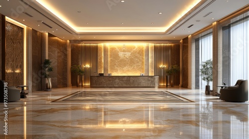 © B 7 YOU, Fototapeta premium A spacious, luxurious hotel lobby with a marble floor, a reception desk, and large windows.