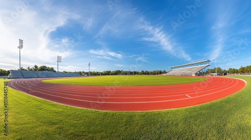 Obraz premium A spacious outdoor track and field stadium with a red running track, surrounded by green grass and bleachers, Dynamic style