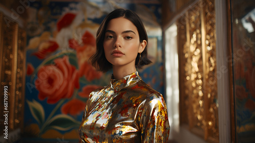 © l1gend, Fototapeta premium a spanish girl in her 20s, traditional, tight shiny metallic and floral dress