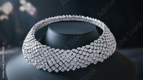 © embun, Fototapeta premium A sparkling diamond necklace displayed on a black presentation bust