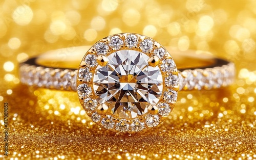 © Lavanya, Fototapeta premium A sparkling diamond ring on a glittering golden background, showcasing luxury and elegance.