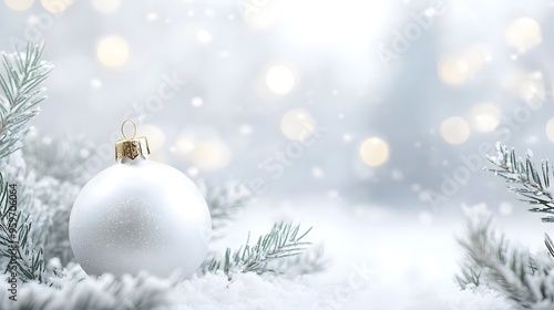 Fototapeta premium A sparkling white Christmas ornament nestled among frosted evergreen branches with a soft, blurred background of snowy bokeh lights.