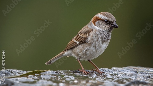 © Sona, Fototapeta premium A sparrow perched on a surface with a blurred green background.