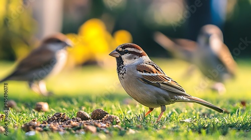 Naklejka premium A sparrow with brown and white feathers stands on green grass with blurred...