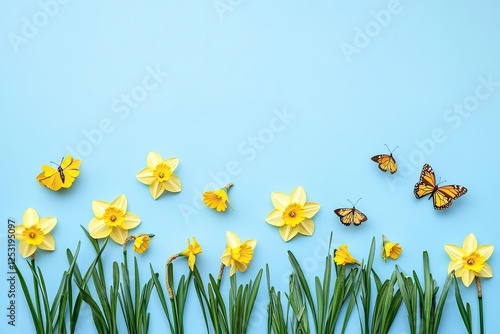 © Velar, Fototapeta premium A sparse light blue spring backdrop featuring daffodils