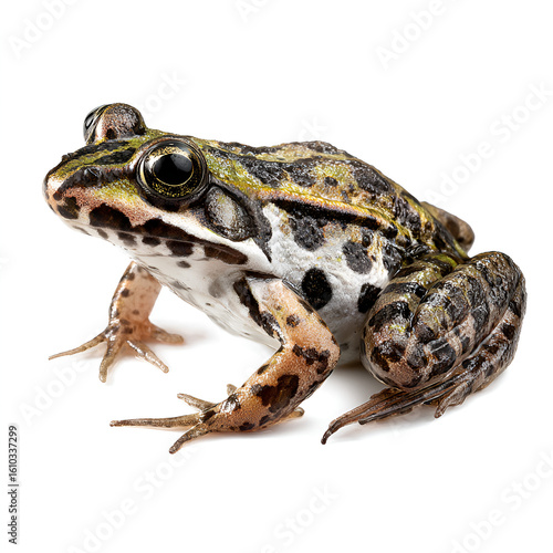 Fototapeta premium A speckled frog isolated on white background showing detailed texture and coloration