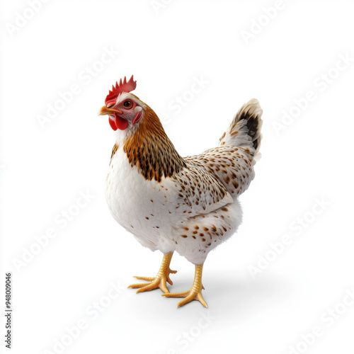 © khonkangrua, Fototapeta premium A speckled hen stands on a plain white background, showcasing its colorful plumage and alert posture.
