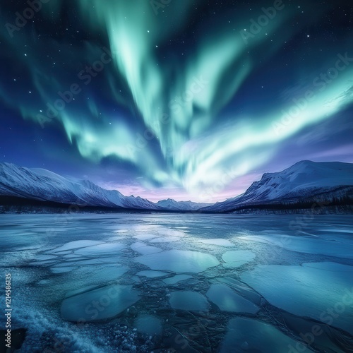 Naklejka premium A spectacular aurora borealis display of colors . Vivid auroras illuminate a serene icy landscape at twilight.