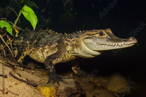 Fototapeta premium A spectacular image of a black caiman lurking in the dark waters of the...
