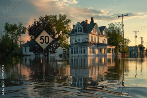 Naklejka premium A speed limit sign partially submerged in floodwaters, with a residential...