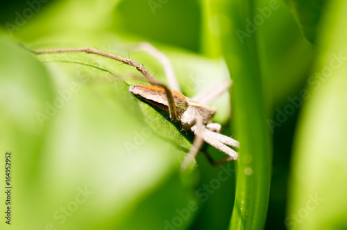 © schankz, Naklejka premium A spider on a green leaf in nature