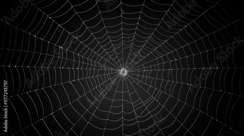 © Oratai, Fototapeta premium A spider web intricately woven, its delicate threads forming a geometric pattern, set against a stark black wall.