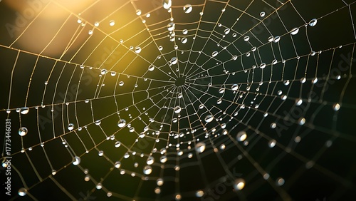 Naklejka premium A spider web with morning dew drops, backlit by soft sunlight. wildlife magazines, conservation campaigns, designed for eco-tourism storytelling, used by chefs.