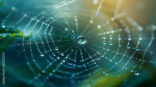 © JuroStock, Naklejka premium A spider web with water droplets on it. The web is blue and green