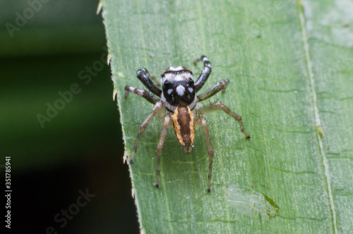 Fototapeta premium A spider with a black body and the yellow part is walking on the leaves.