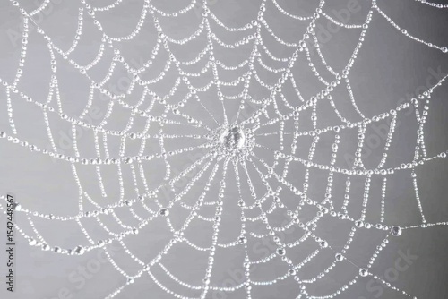 © thimira, Fototapeta premium A spiderweb glistens with morning dew, each drop catching the light, creating a delicate, ethereal work of natural art.