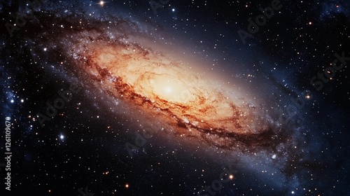 © dewboreas, Fototapeta premium A spiral galaxy with a bright yellow center. The galaxy is filled with stars and is surrounded by a dark blue sky
