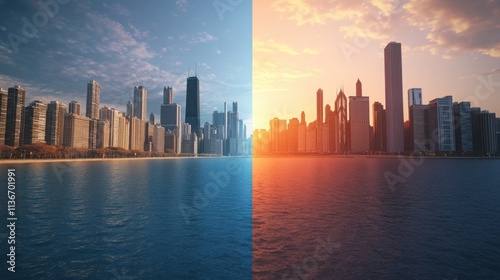 Naklejka premium A split image of the Chicago skyline by day and night, both incorporating the...