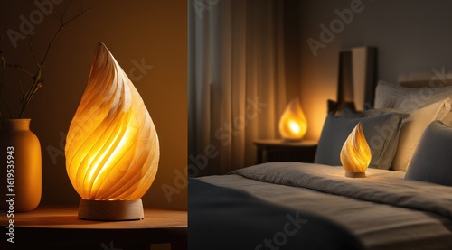 © Gent, Obraz premium A split image showcasing a unique, teardrop-shaped table lamp with warm, ambient light, displayed on a nightstand and in a dimly lit bedroom setting