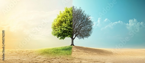 Fototapeta premium A split tree symbolizes contrasting environments lush greenery versus arid...